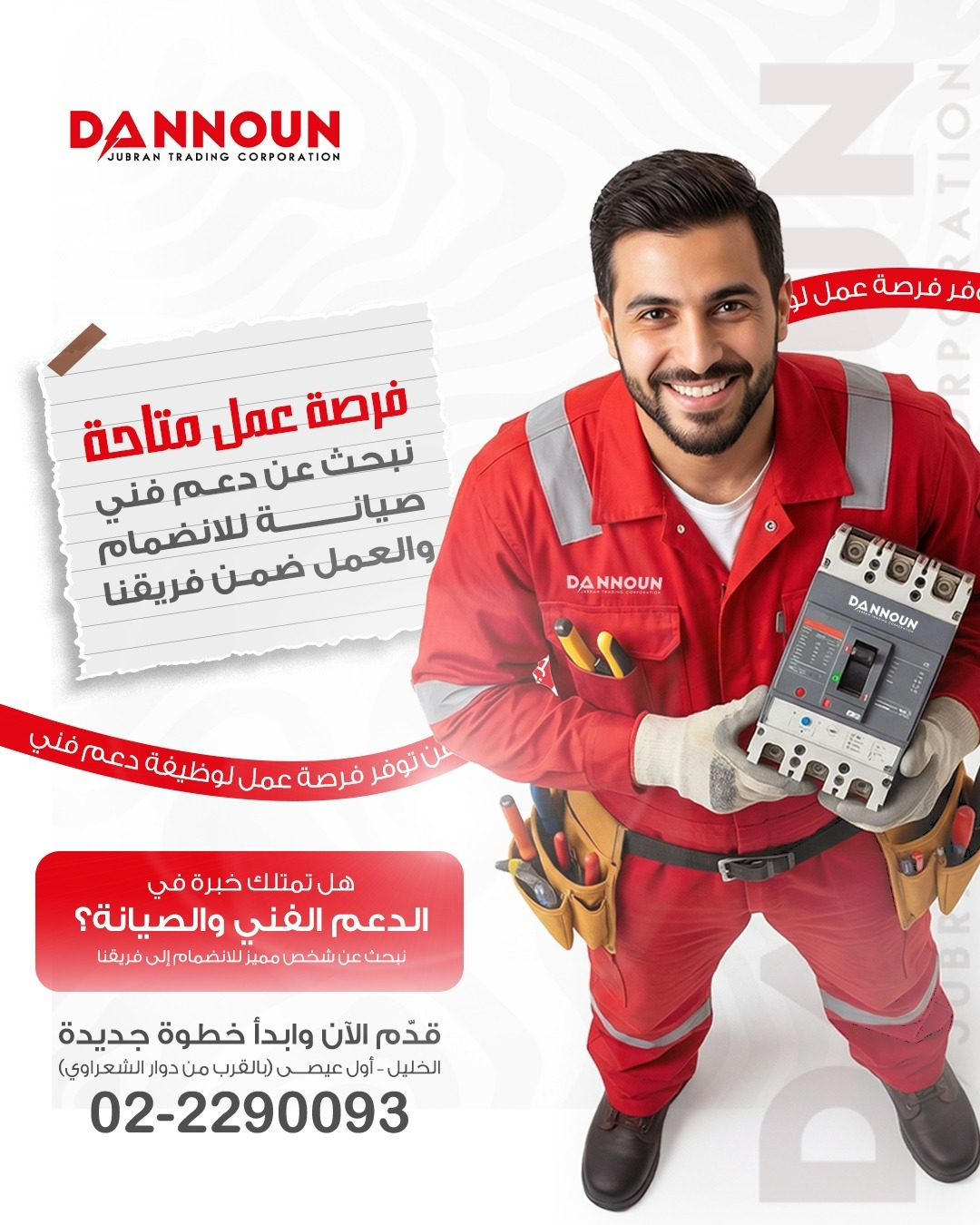 تعلن شركة دنون للكهرباء الصناعية عن فتح المجال لانضمام موظفين اثنين لوظيفة دعم فني وصيانة ضمن فريق عملي ومتطور.
